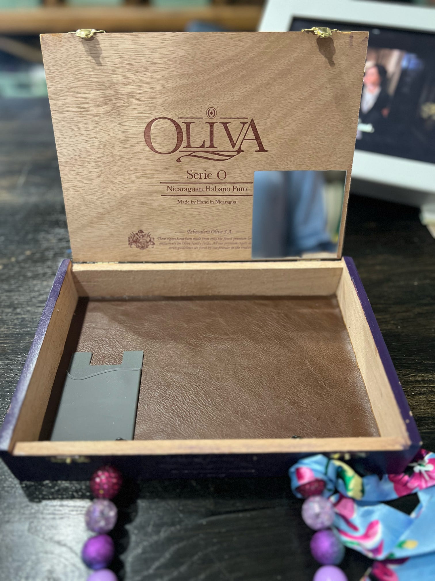 Grateful Dead fans, meet your dream bag. A rustic cigar box transformed into a show-stopping purse featuring a floral skull made of real dried roses and florals. The back boasts bold “GRATEFUL DEAD” lettering on rich purple, and it’s signed by the artist (Sarah). Inside, enjoy a mirror, leather-look brown base, and sleek gray card holder. Handle wrapped in groovy beads and floral scarf.