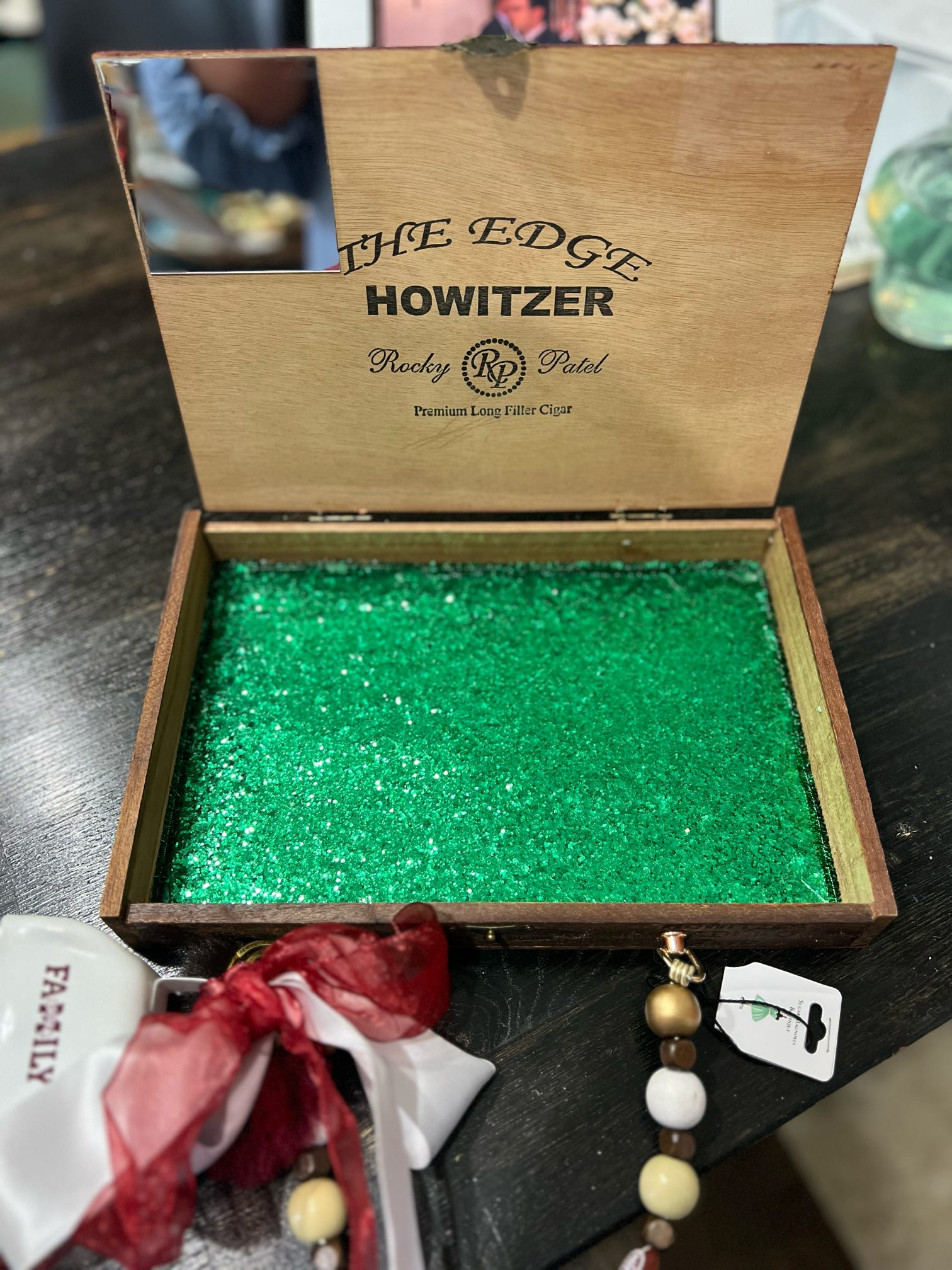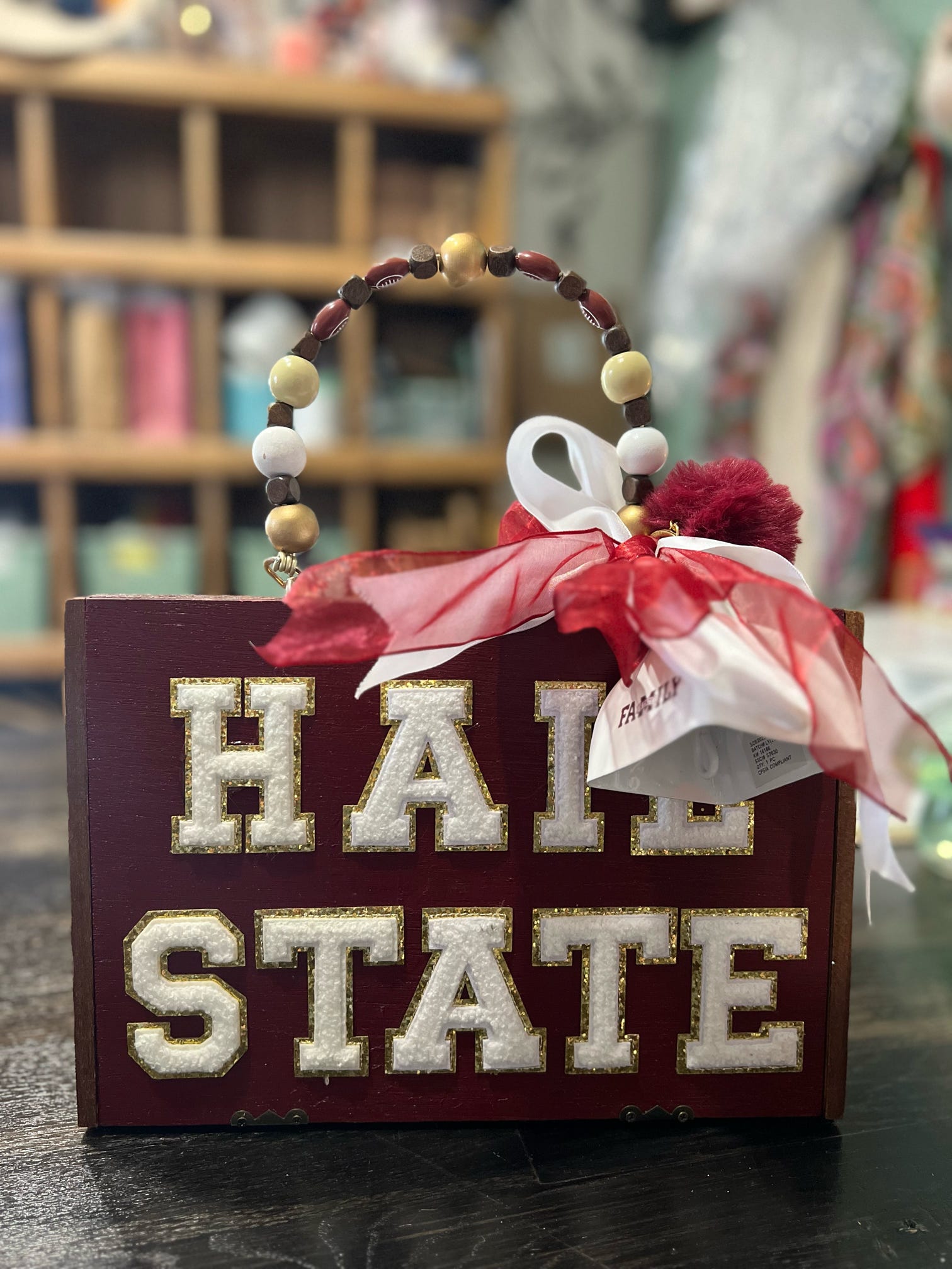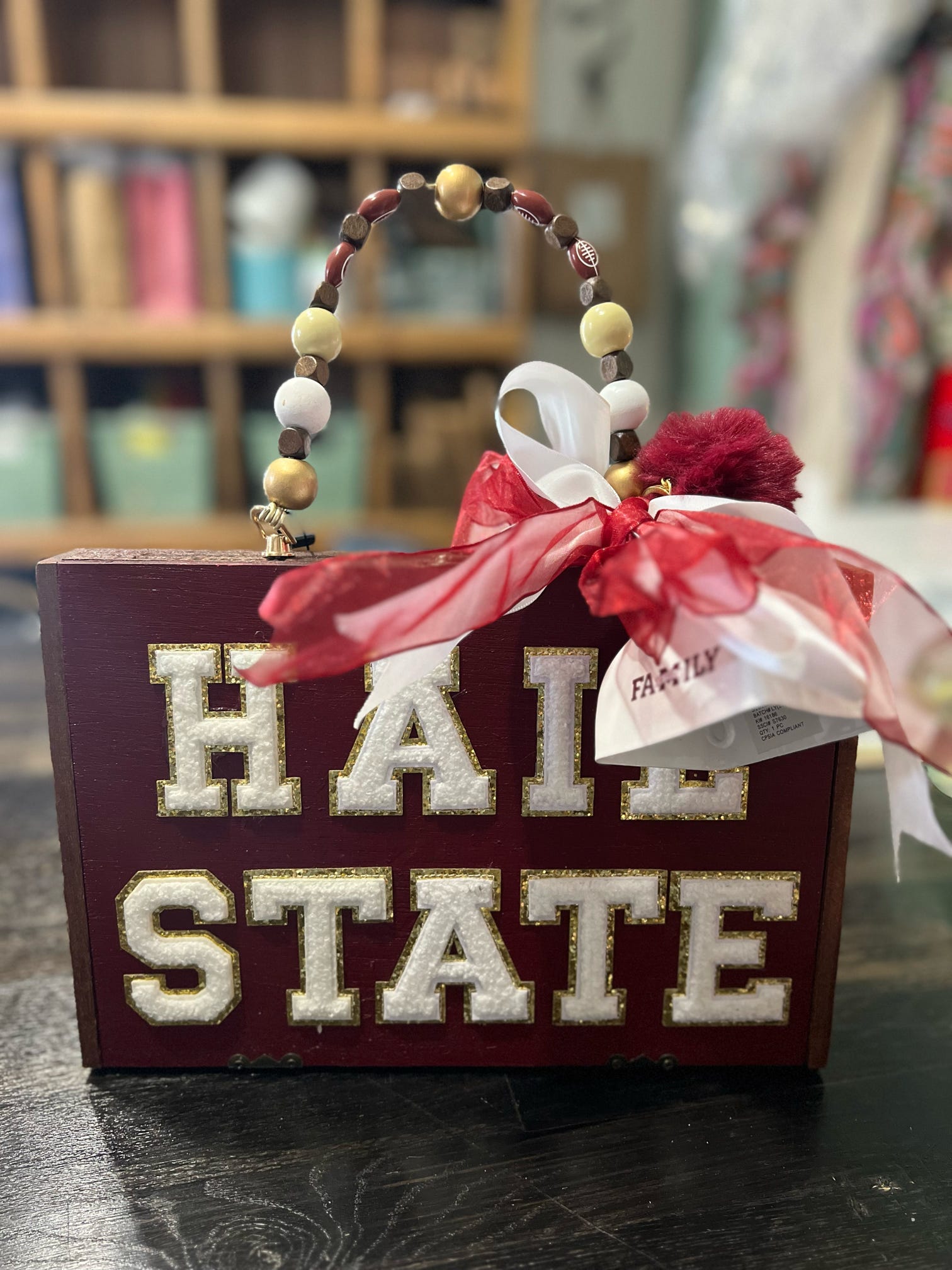 Show your Bulldog pride with this one-of-a-kind handmade cigar box purse! This repurposed Rocky Patel cigar box is decked out in maroon and white with raised “HAIL STATE” letters trimmed in gold glitter. The back features the MSU fight song and a football embellishment, while the beaded handle and oversized bow add major gameday charm.