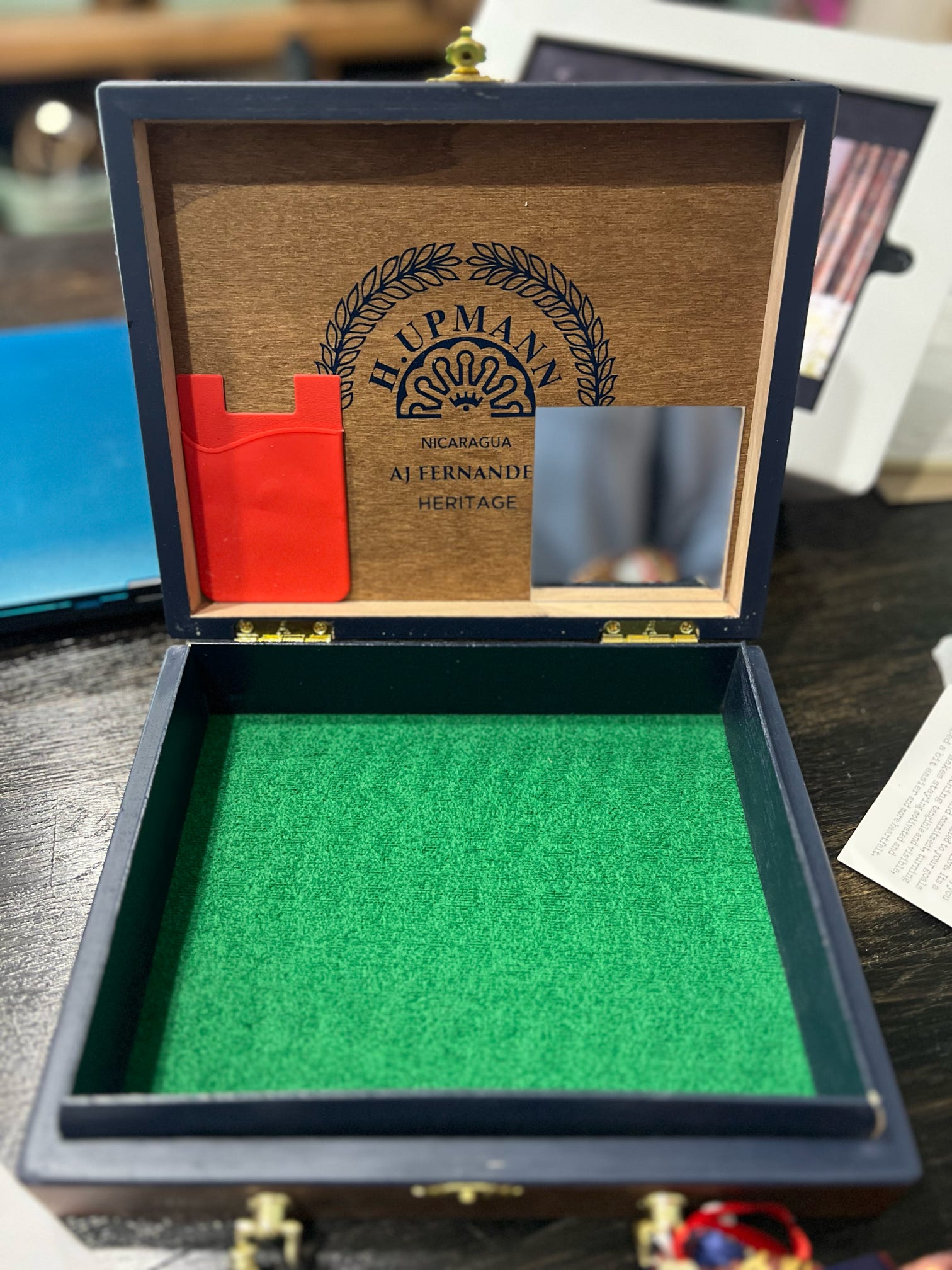 Calling all Rebel fans! This repurposed H. Upmann cigar box has been transformed into a spirited purse featuring "We Are Ole Miss" on the front and "I Am a Rebel" on the back. A football graphic, red and blue beads, and a knotted scarf handle bring serious tailgate vibes.