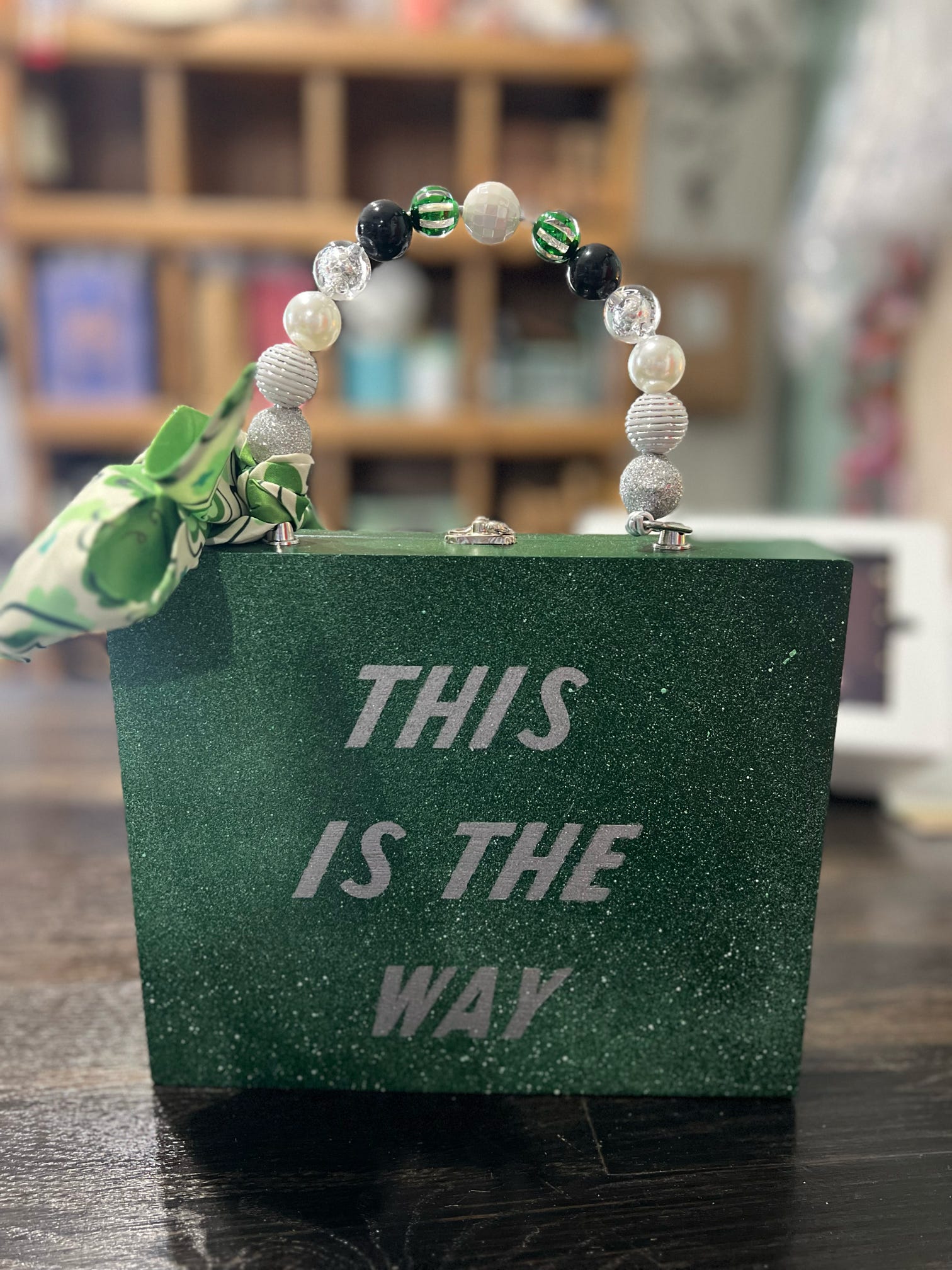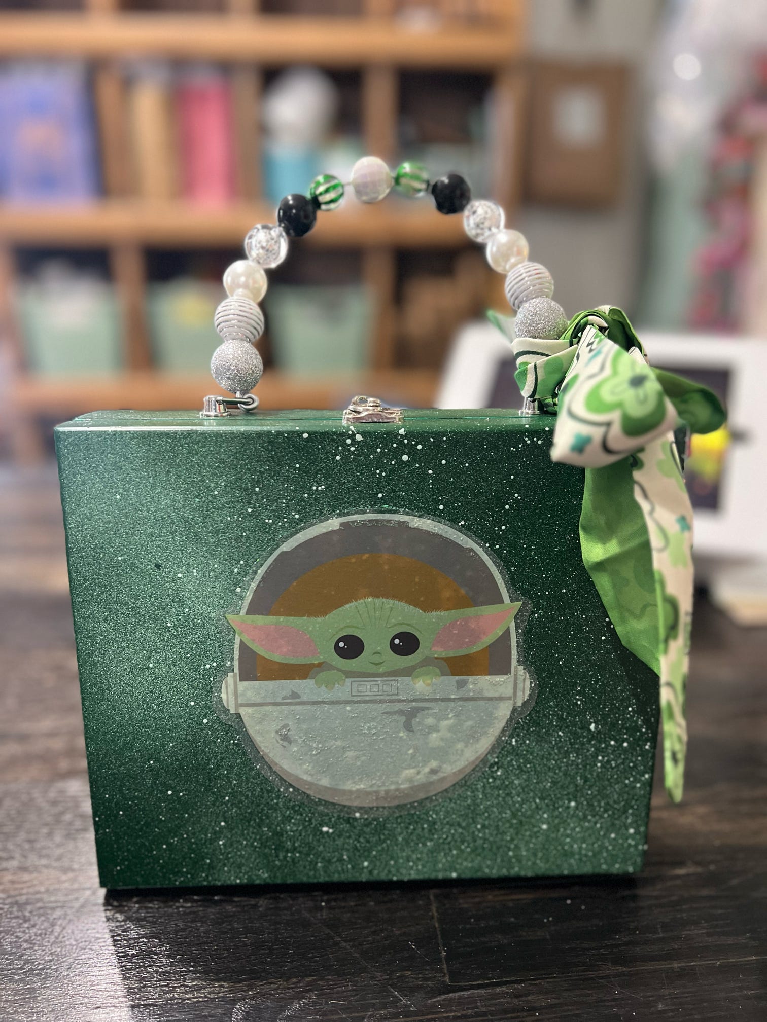 This one-of-a-kind purse is a galactic statement piece! Crafted from a real cigar box, it features an adorable Baby Yoda (Grogu) decal on a shimmering green galaxy background. The back is hand-lettered with "This Is The Way" in bold silver, perfect for any Star Wars fan. The beaded handle blends black, green, white, and silver for a playful, otherworldly flair, topped off with a patterned green scarf bow.